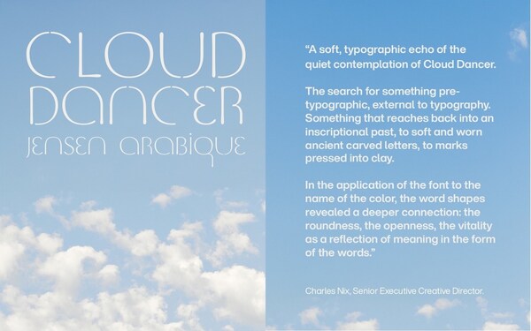 上海2025年12月5日 美通社 -- 2026年12月4日,蒙纳字库为年度Pantone色彩 PANTONE 11-4201 Cloud Dancer 赋予了其首个字体表达。这一表达由蒙纳资深执行创意字体总监 Charles Nix 选定,即 Jensen Arabique™ 字体。该字体由独立设计师 Jason Castle 于三十余年前创作,灵感源自 Gustav Jensen 的经典字母设计。