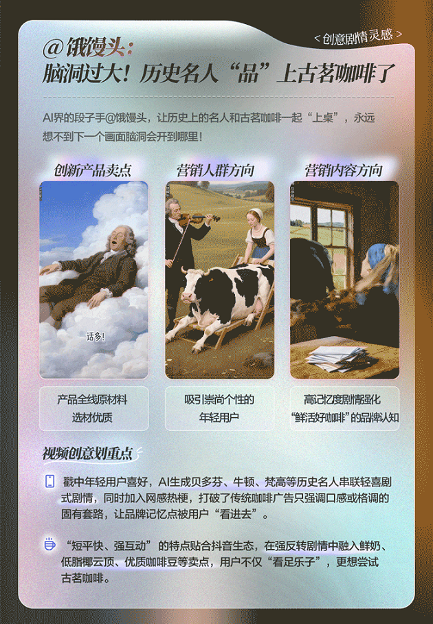本期,我们精选了5个不同方向的巨量星图AI达人案例:有的以山河肌理重塑产品气质,有的用一条AI时光轴讲透品牌进化,也有人把味觉、情绪、历史名人甚至恐龙“请”进镜头,让营销不再是套路,而是一场可看、可感、可玩的新体验。