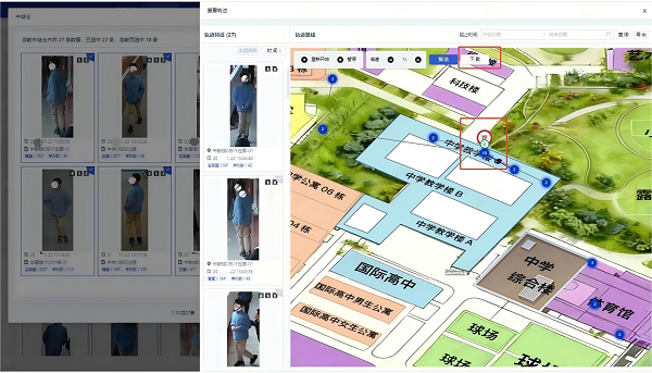 (2)轨迹一键生成:支持全域全时段检索,2分钟内生成完整行动轨迹,可快速定位学生位置;